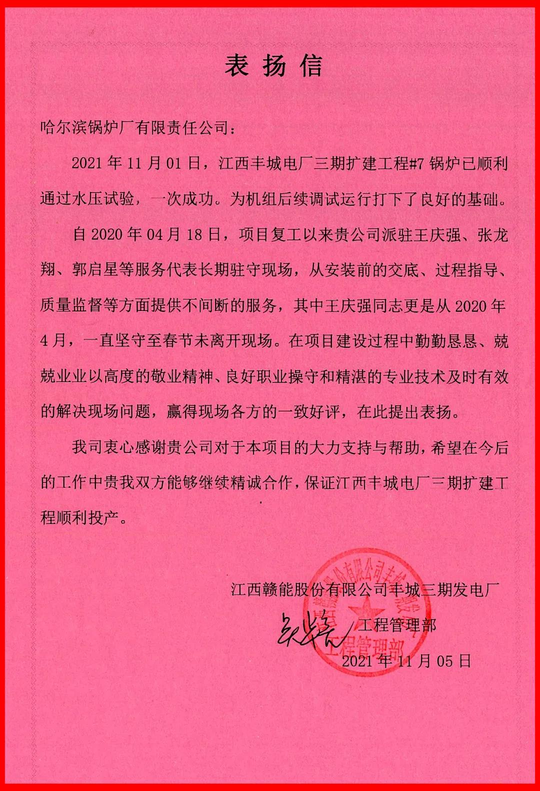哈电锅炉以用户需求为导向,通力合作力保供货,兑现了向用户许下的承诺,得到了用户的高度认可。用户专门发来感谢信,对哈电锅炉提供的工作支持表示衷心的感谢。下一步,哈电锅炉各部门将继续保持密切配合,为用户提供优质高效的服务,为机组顺利投产保驾护航。