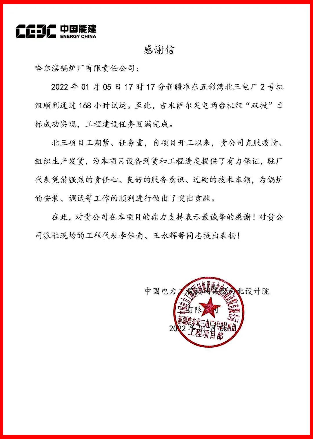 新疆准东五彩湾北三电厂2号锅炉机组是哈电锅炉在2022年投运的首台超超临界锅炉机组。为了确保机组按期投产,在设备供货阶段,哈电锅炉各部门克服疫情影响,通力合作组织生产和设备运输,确保设备交付进度满足现场安装需求。在机组的安装调试阶段,哈电锅炉选派业务骨干担任安装代表,配合现场圆满完成了各项安装调试任务。在机组试运行期间,锅炉设备整体运行稳定、各项性能指标优良,机组顺利进入商业运行阶段。