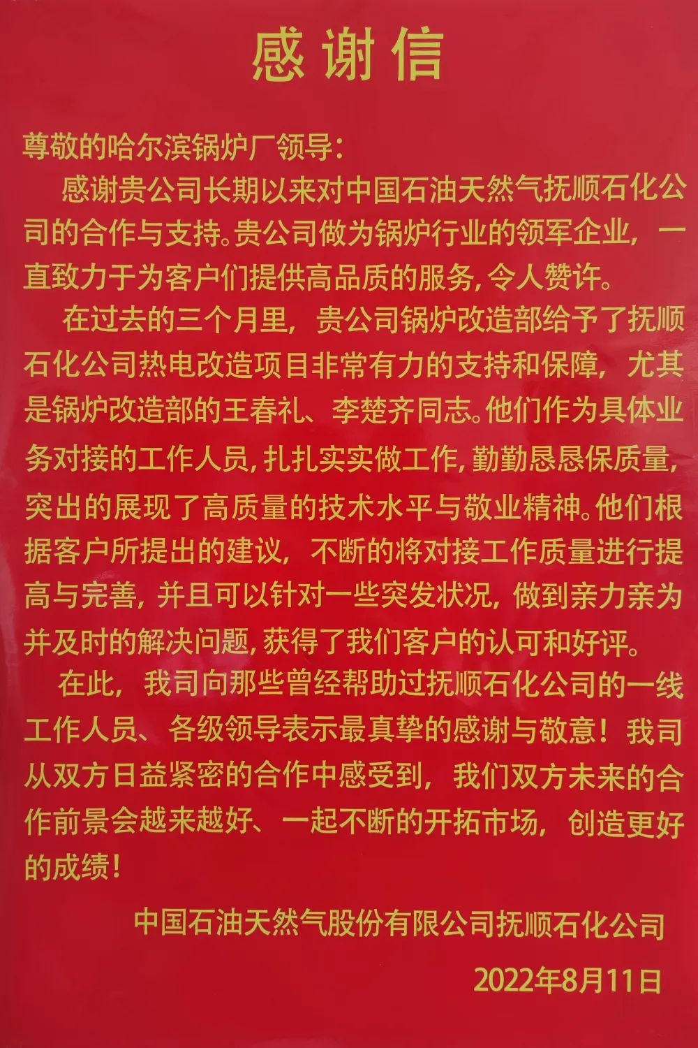 发布时间:2022-08-23日前,哈电锅炉圆满完成了中国石油天然气股份有限公司抚顺石化公司9号、10号锅炉导汽管供货工作,以实际行动满足了用户需求。
