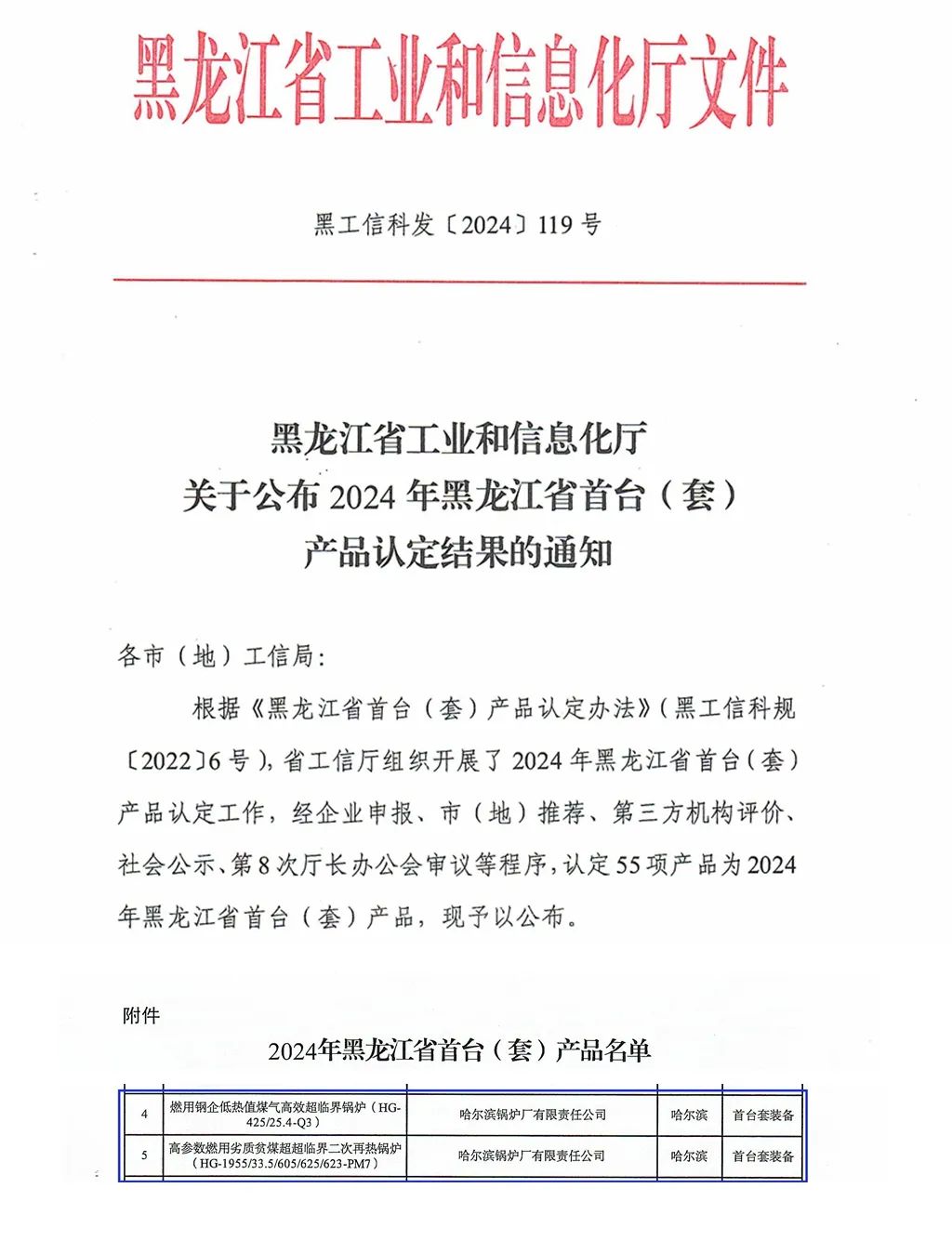 发布时间:2024-08-20近日,黑龙江省工业和信息化厅发布了《2024年黑龙江省首台(套)产品认定结果》,哈电锅炉作为主要研制单位参与的“高参数燃用劣质贫煤超超临界二次再热锅炉”“燃用钢企低热值煤气高效超临界锅炉”两项目成功入选。