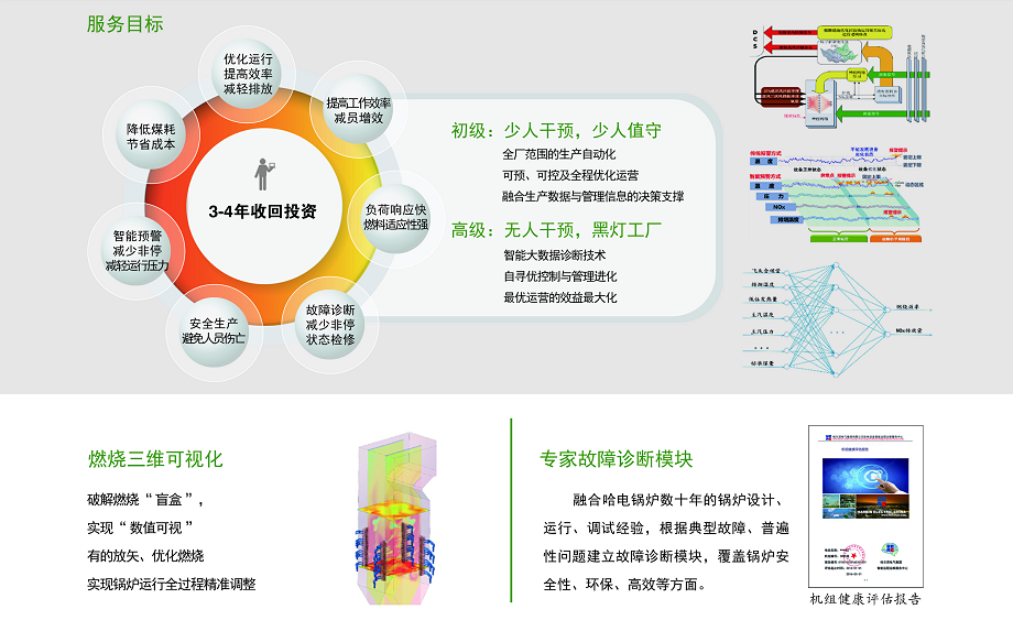 In the intelligent power plant, it is possible to acquire the optimistic performance/price goal of the operating unit through a high-degree integration of intelligent control, intelligent diagnosis, and intelligent decision-making on basis of a platform of integrated management and control. HBC, as a main machine manufacturer focuses on the intelligentization of boiler equipment, and has developed furnace visualization system, fault warning and diagnosis system, model prediction and advanced control system, and boiler safety and service life monitoring system, which cover the scenarios that are concerned most about by users, in the fields such as boiler operation, maintenance, control and safety. The effects of such efforts are all-round improvement of the safe, reliable, clean and efficient operation of boilers.