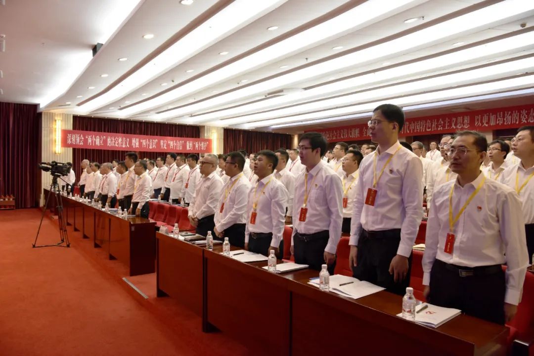 大会现场灯光璀璨,气氛热烈。主席台后幕正中是熠熠生辉的党徽,10面鲜艳的红旗分列两侧。主席台对面和两侧分别悬挂着“高举中国特色社会主义伟大旗帜 全面贯彻习近平新时代中国特色社会主义思想 以更加昂扬的姿态奋进新征程、建功新时代”“深刻领会‘两个确立’的决定性意义 增强‘四个意识’ 坚定‘四个自信’ 做到‘两个维护’”“学深悟透党的创新理论 从党的百年奋斗重大成就和历史经验中汲取奋进力量”的横幅。