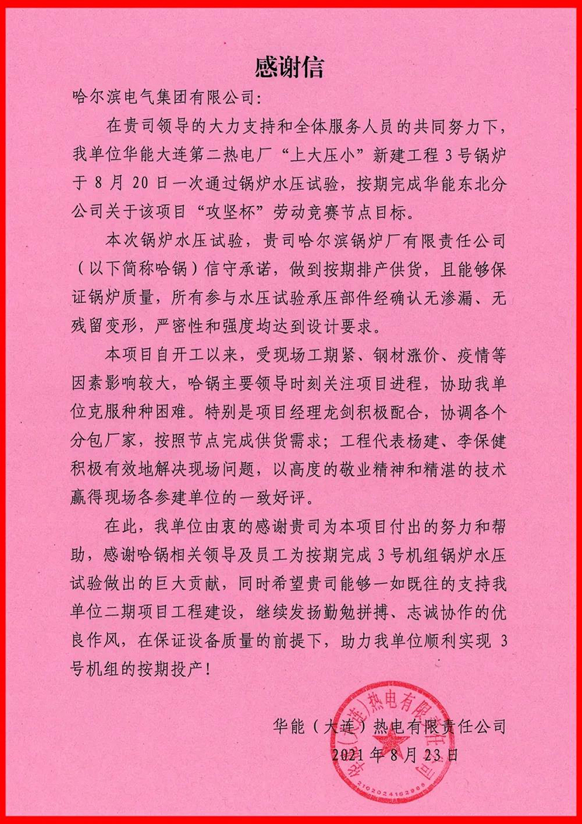 哈电锅炉各部门急用户之所急,心往一处想、劲往一处使,圆满完成了产品供货工作。过硬的产品质量和优质的服务,赢得了用户的高度认可。用户特发来感谢信表示感谢。