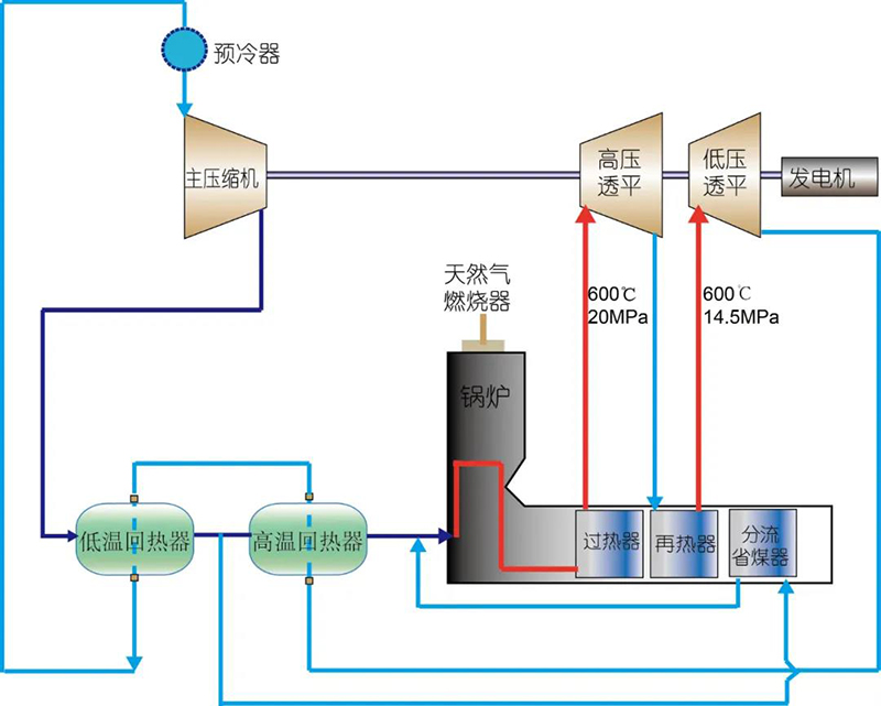 超临界CO2发电是新型高效的发电技术,具备多重先进性。同时,超临界CO2发电系统结构简单紧凑、灵活性更强,可实现热电完全解耦(实现热能和电能相对独立的调度与分配,尤其是在冬季供暖期,可有效降低弃电率,大幅提升发电机组的调峰性能),能够为太阳能、风能等间歇性不稳定可再生能源深度调峰提供有力支撑,符合未来能源体系建设的重大需求。与传统蒸汽朗肯循环相比,哈电锅炉参建的5MWe超临界CO2循环发电试验机组采用了布雷顿循环,在相同参数下,发电效率可提高3%-5%。作为试验平台配套的核心设备之一,由哈电锅炉自主研发制造的超临界CO2锅炉输入热功率接近20MW,受热面内以超临界态CO2为工质,与传统以H2O作为工质的锅炉传热特性相比,在参数上具有大流量、小焓升等特征。超临界CO2锅炉采用了更方便进行现场试验测试的L型布置、一次中间再热、顶置低NOX燃烧器的总体布置结构,深度契合试验平台主要进行循环和设备测试验证的建设目标。