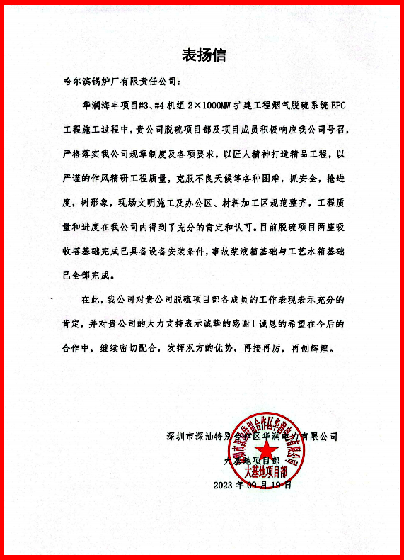 哈电锅炉环保公司负责华润海丰项目的执行工作。环保公司始终坚持“以客户为中心、以匠心打造品牌”的工作宗旨,班子成员多次到现场实地了解工程建设情况和用户需求。环保公司选派多名业务骨干进驻到项目现场、组建现场项目部,并充分发挥总承包工程设计、采购、施工一体的综合管理优势,每周组织召开项目专题推进会,及时协调解决问题、部署下一步工作。得益于项目前期环保公司的高效组织协调,各项准备工作按计划逐项落实,项目于2023年7月27日正式开工。在完成土建施工工作后,环保公司于2023年9月23日开始了设备安装工作。在项目建设进度有序推进的同时,环保公司不断加强现场文明施工管理,合理规划利用办公区域,对材料加工区域等实行定置精细化管理,工作秩序井然,为哈电锅炉树立了良好的企业形象。用户特地发来表扬信,对哈电锅炉提供的工作支持表示感谢,对哈电锅炉干部职工的敬业精神表示赞许。