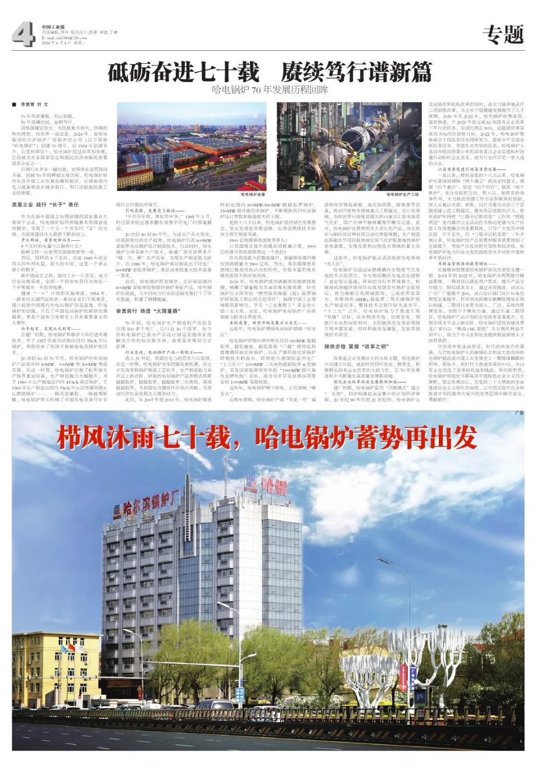 作为共和国装备制造业的“长子”和电站锅炉产业的“摇篮”,哈锅创建70周年受到行业权威媒体的关注,“哈锅70年发展历程回眸”报道于创建70周年纪念日——6月4日当天,在中国工业报、中国电力报主要版面头条位置刊发。